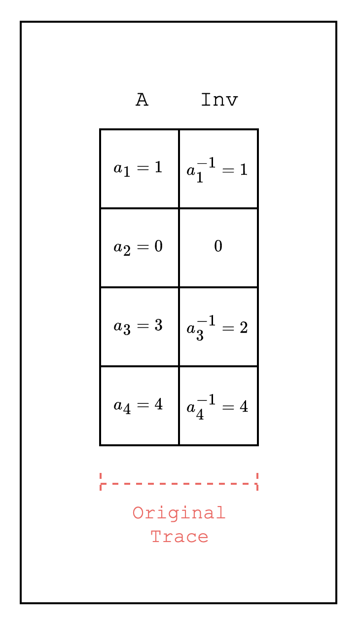 For example, in Figure 2, we want to check that a field element in is zero. We create a new column that contains the multiplicative inverse of each field element . We then use the multiplication of the two columns and check whether the result is 0 or 1. Note that if the existing column has a zero element, we can insert any value in the new column since the multiplication will always be zero.