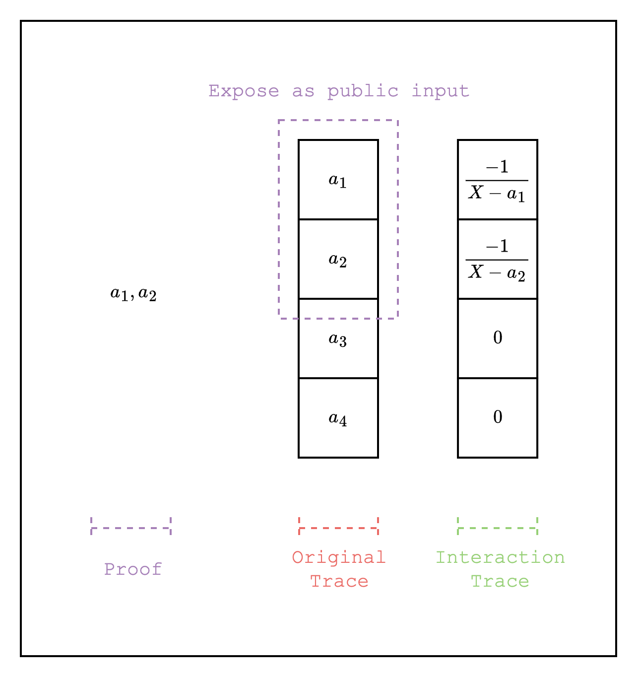 In Stwo, we can achieve this by adding the public input portion of the trace as a LogUp column as negative multiplicity. As shown in Figure 3, the public inputs are added as LogUp values with negative multiplicity and . The public inputs are given to the verifier as part of the proof and the verifier can directly compute the LogUp values with positive multiplicity and and add it to the LogUp sum and check that the total sum is 0.