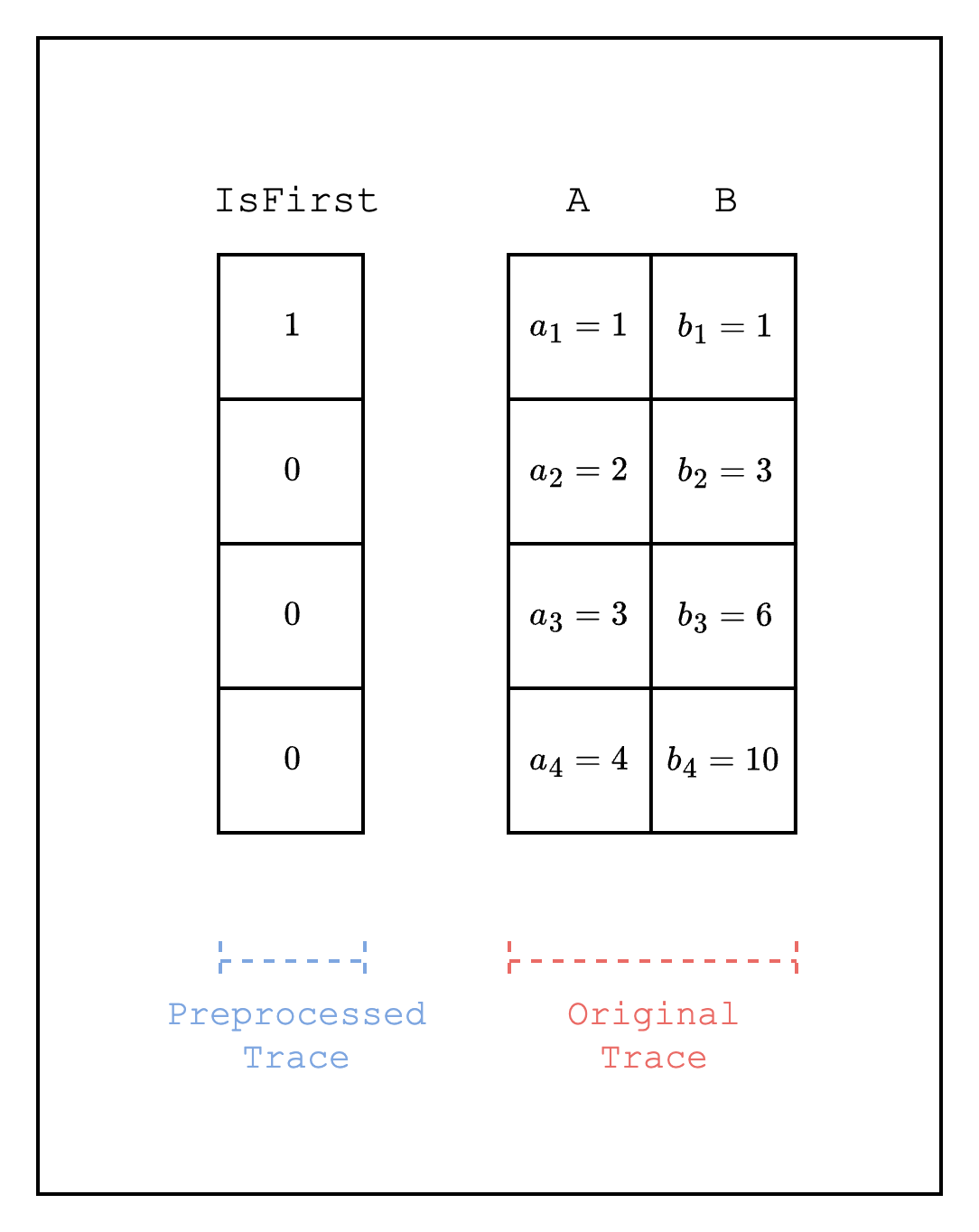 For example, as seen in Figure 1, when we want to track the cumulative sum of a column, i.e. , the previous row of the first row will point to the last row, creating an incorrect constraint . Thus, we need to disable the constraint for the first row and enable a separate constraint . This can be achieved by using a selector column that has a value of 1 on the first row and 0 on the other rows and multiplying the constraint by the selector column: