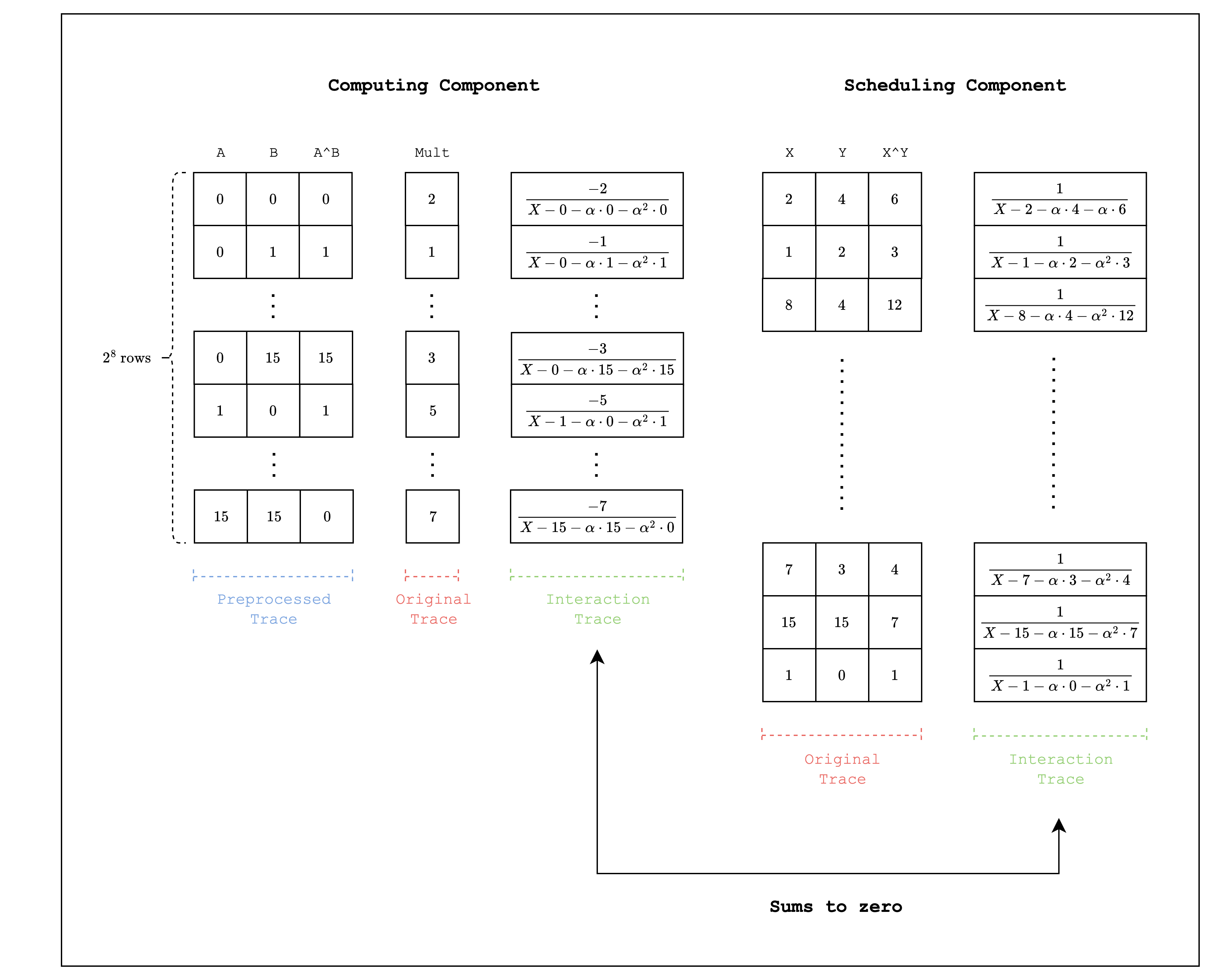 For example, Figure 4 shows the XOR operation for 4-bit integers. To accommodate the entire combination of inputs, the size of the trace for the computing component is rows. Note that the size of the trace for the scheduling component does not have to be the same as the computing component.